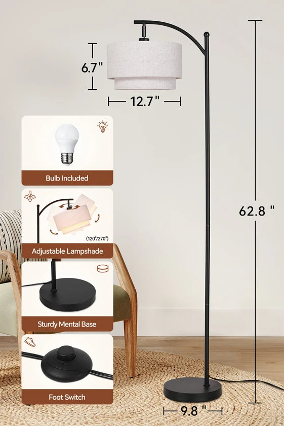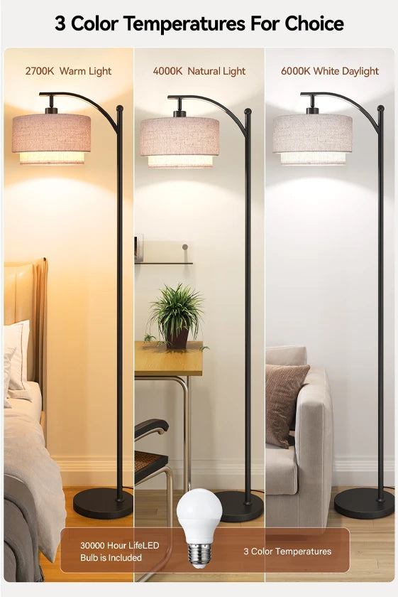 SUNMORY Arc Floor Lamp includes an energy-efficient 12W LED bulb. With adjustable color temperatures, simply tap the foot switch to cycle through lighting modes hands-free.