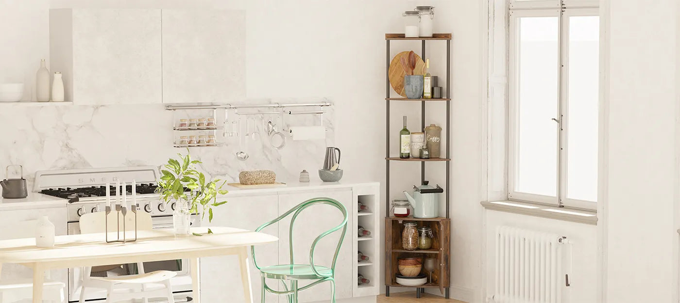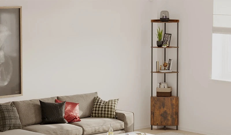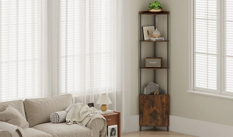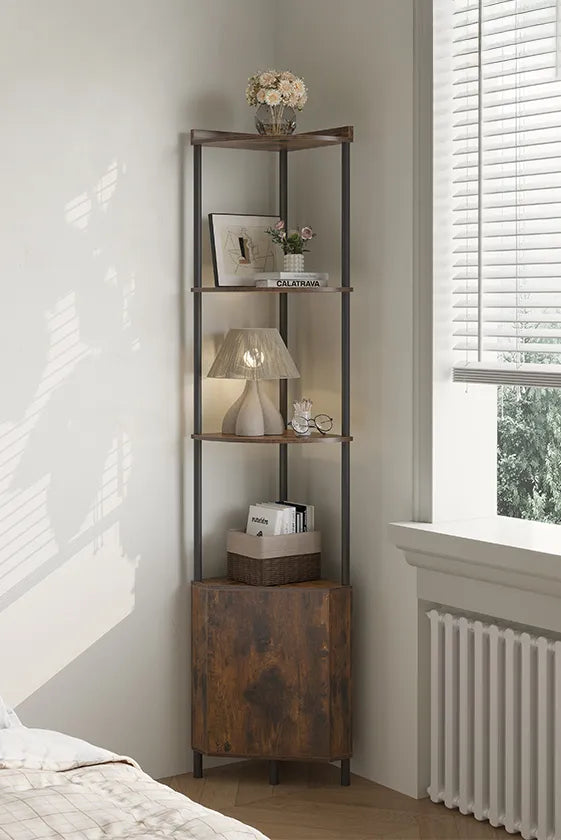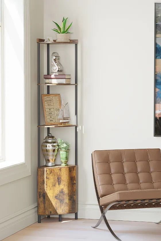 Make the most of every corner with this 5-tier storage shelf. Blending rustic wood and sturdy metal, it features open and enclosed space, a safe anti-tip design, and tool-free assembly—style meets function in minutes.