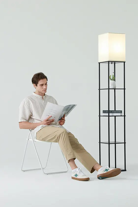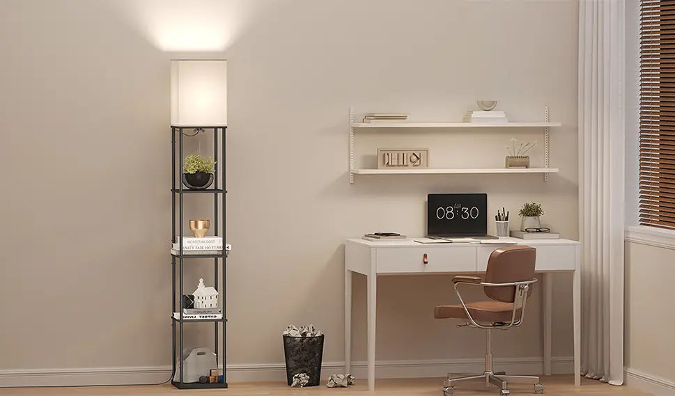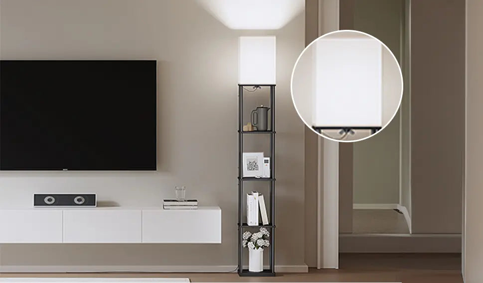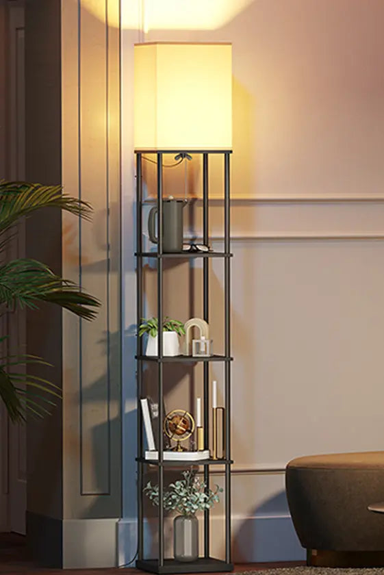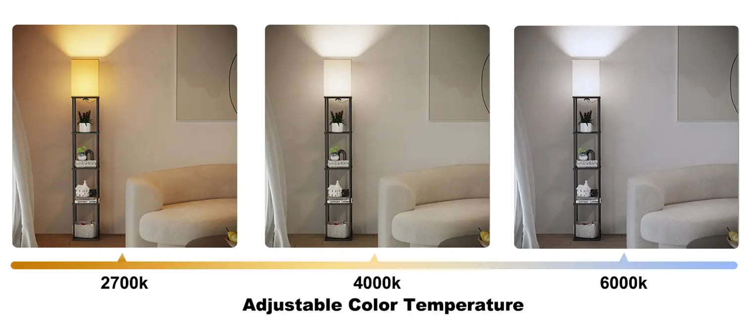 Our Floor Lamp transforms any corner into a sanctuary of light and order. The soft cloth shade diffuses a gentle glow in three perfect temperatures—warm amber for cozy evenings, neutral for reading, or cool brightness for focused tasks. Five sturdy shelves beautifully display your treasured items while keeping essentials within reach, all in a sleek design that effortlessly complements any décor from modern to farmhouse.