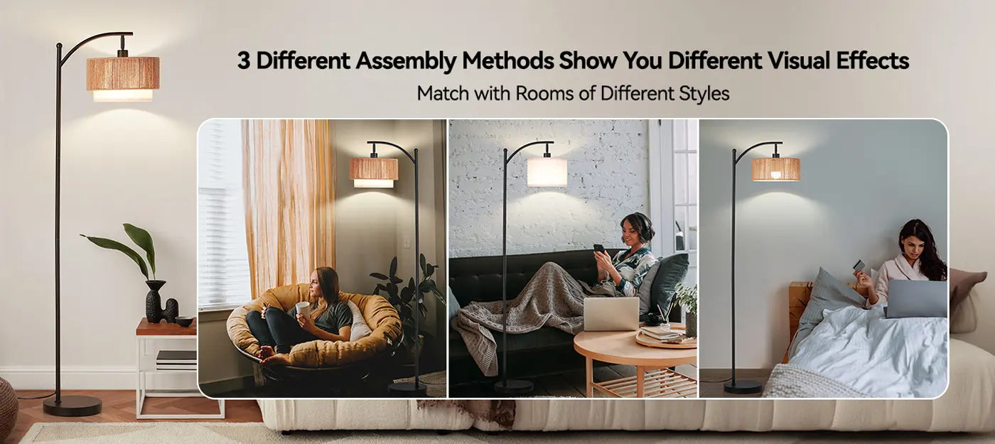 A modern arc floor lamp with rattan charm and fabric softness. Features 3-color LED lighting, adjustable angles, two interchangeable shades, and a sturdy base for safe, cozy living.