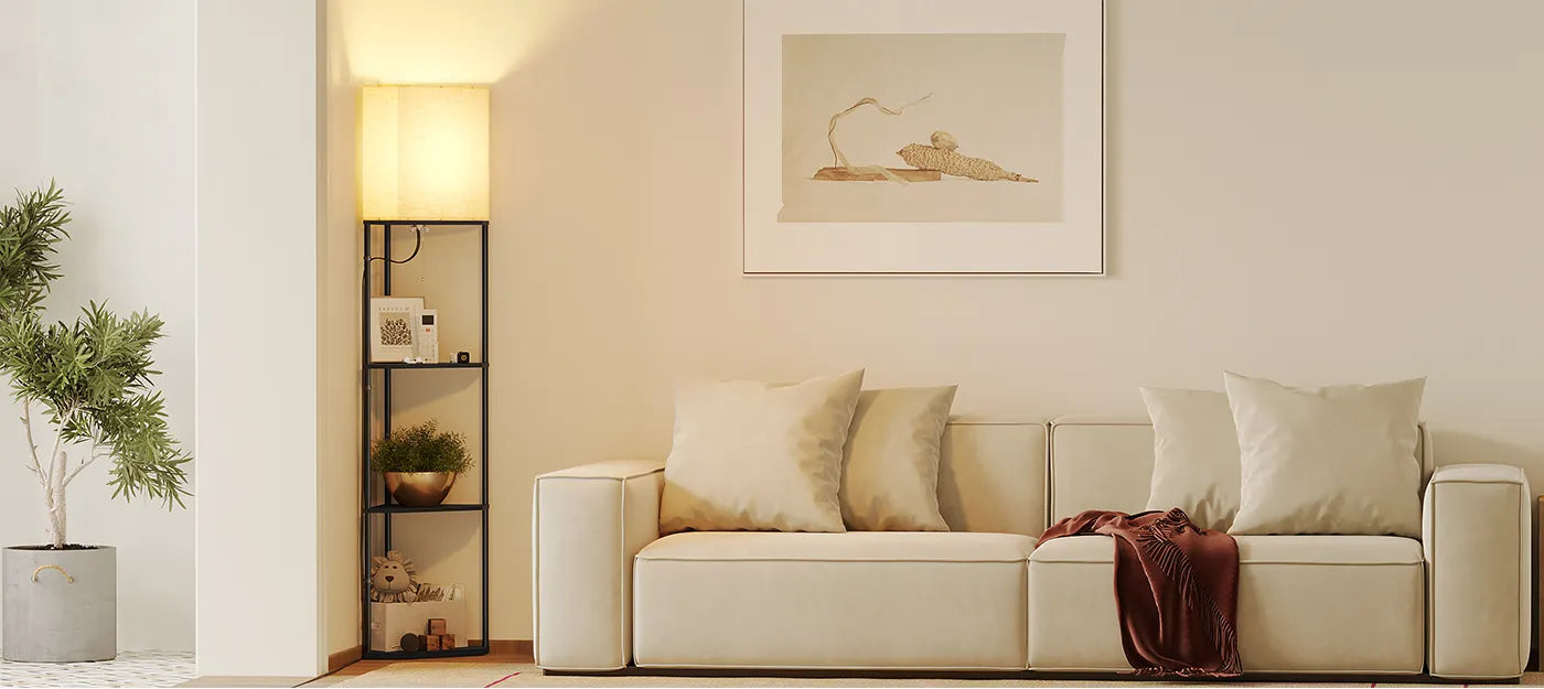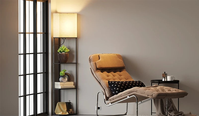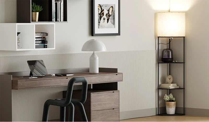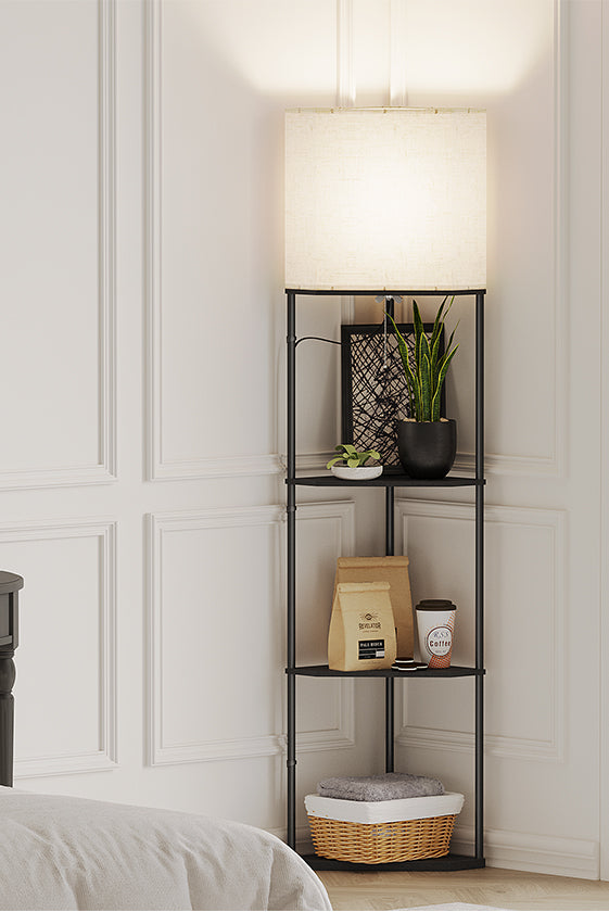 This corner floor lamp combines an overhead light with a three-tiered fan-shaped shelf. It serves as both a lighting fixture and a display shelf, letting you showcase ornaments, photo albums, plants, or books while illuminating your space.