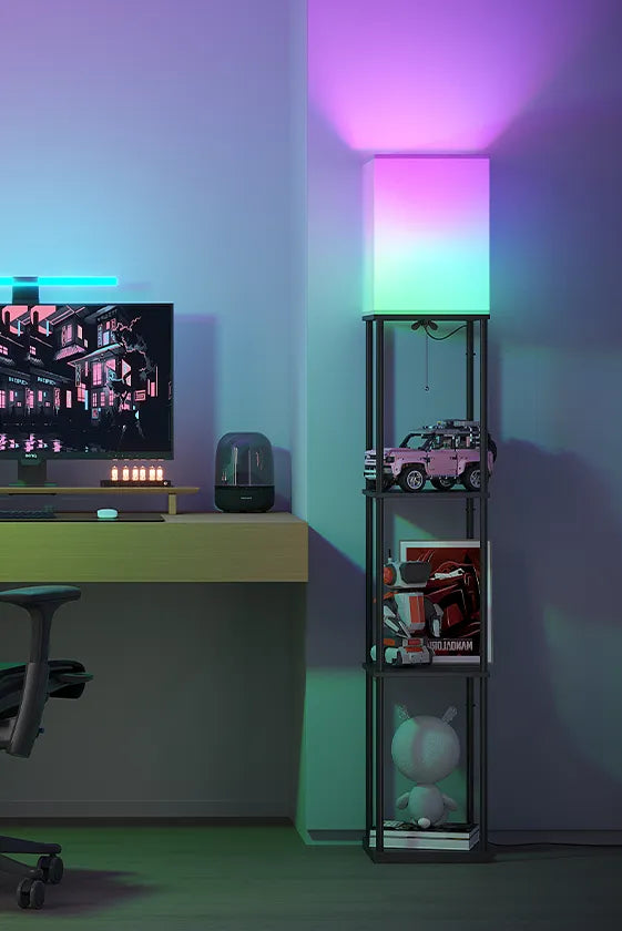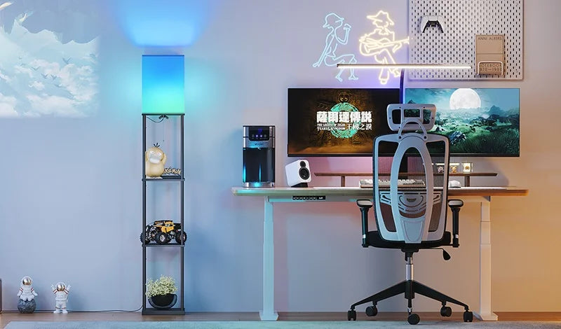 Voice-controlled RGB floor lamp with EyeSafe® lighting & 16M colors. Features music-sync modes, 22kg floating shelves, and 10-min snap assembly. Certified for nurseries, game rooms, and home offices—transform spaces in seconds.