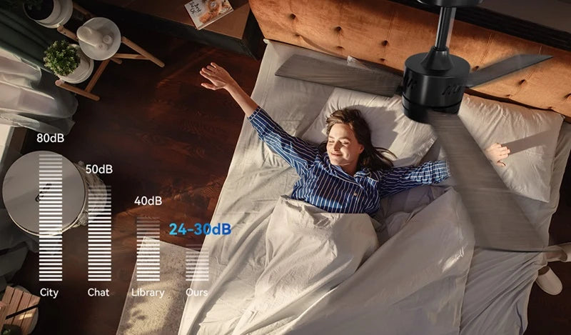 Energy-efficient motor runs quietly below 30 dB—70% quieter than traditional fans.